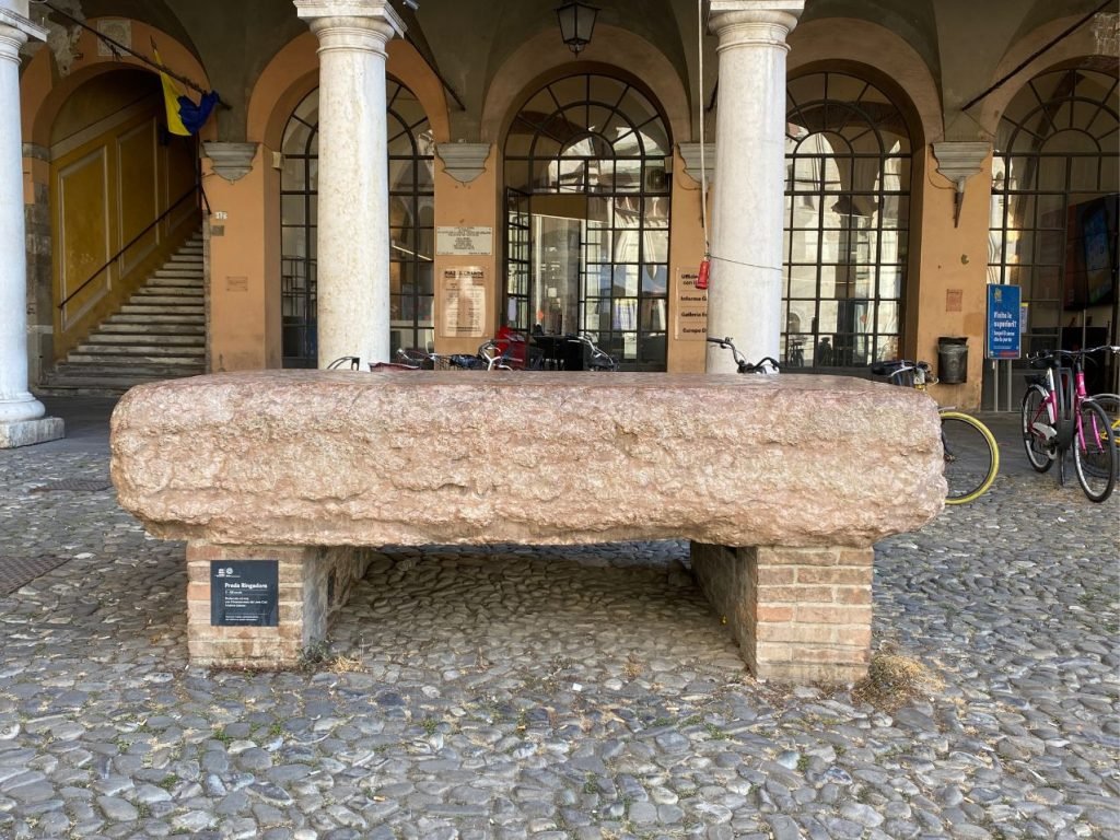 In un angolo della Piazza Grande si trova la curiosa Preda Ringadora, un grande blocco di marmo rosso su cui, in epoca medievale, venivano pronunciati discorsi pubblici o eseguite condanne. Il suo nome deriva dal dialetto modenese: “ringadòr” significa “colui che arringa”. Un dettaglio che racconta molto della storia giudiziaria e civile della città.