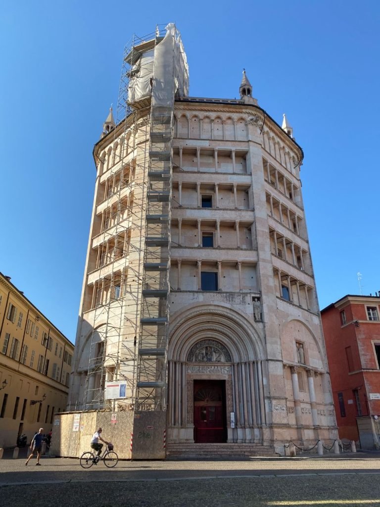 Accanto al Duomo si trova il Battistero di Parma, un’imponente struttura ottagonale in marmo rosa. Progettato dall’architetto Benedetto Antelami, è uno degli esempi più straordinari dell’arte romanica in Italia. Il battistero è famoso per la sua facciata elegante e per gli affreschi che decorano l’interno.