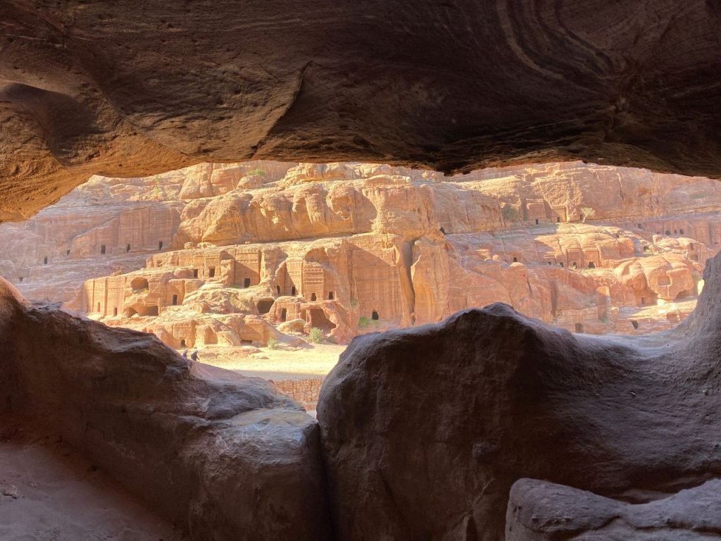 Proseguendo la camminata, Said mi ha fatto notare e vedere anche all’interno tantissimi edifici scavati nella roccia rosa-rossa, come teatri, templi, tombe e case.